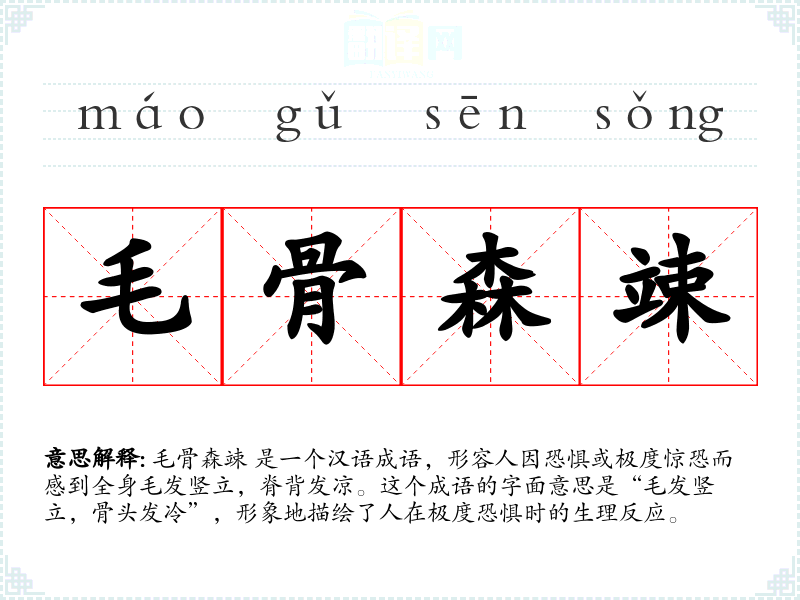毛骨森竦 是一个汉语成语,形容人因恐惧或极度惊恐而感到全身毛发竖立,脊背发凉。这个成语的字面意思是“毛发竖立,骨头发冷”,形象地描绘了人在极度恐惧时的生理反应。