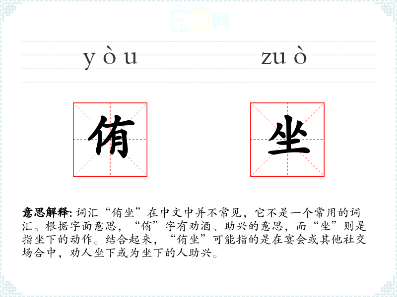 - 总结理解:“侑坐”是一个具有特定文化背景的词汇,虽然在现代汉语中不常用,但在描述古代宴会和礼仪时,可以增加历史感和文化氛围。
