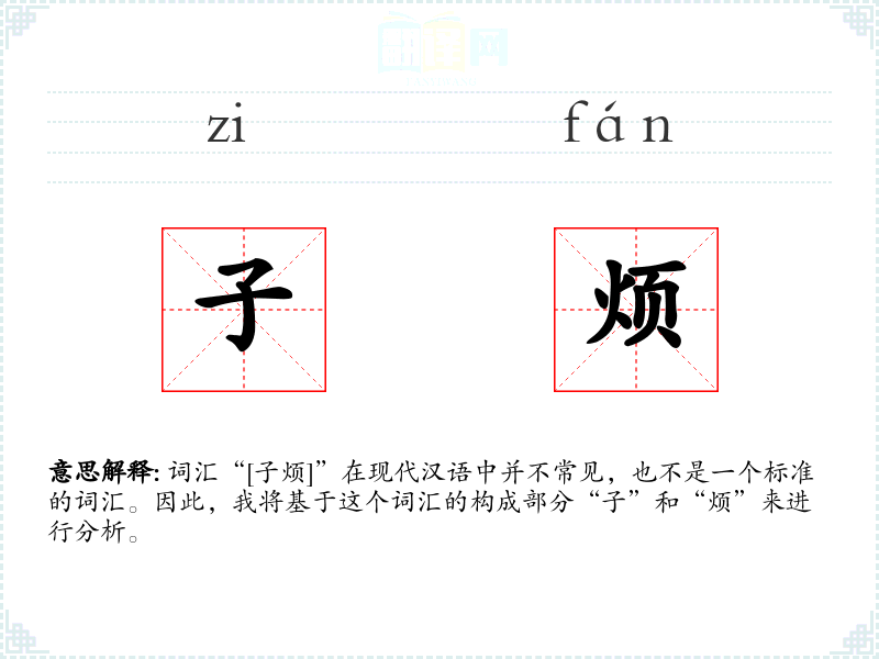 词汇“[子烦]”在现代汉语中并不常见,也不是一个标准的词汇。因此,我将基于这个词汇的构成部分“子”和“烦”来进行分析。