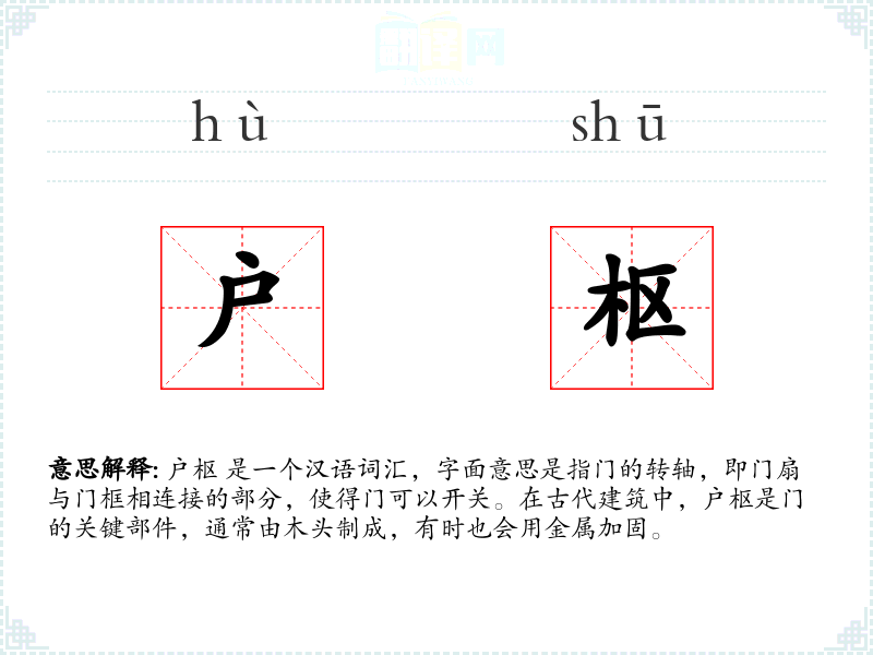 - 反义词:门扇(指门的可移动部分,与户枢相对)