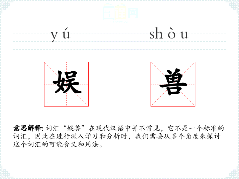 词汇“娱兽”在现代汉语中并不常见,它不是一个标准的词汇,因此在进行深入学习和分析时,我们需要从多个角度来探讨这个词汇的可能含义和用法。