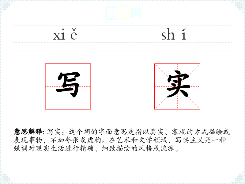 写实:这个词的字面意思是指以真实、客观的方式描绘或表现事物,不加夸张或虚构。在艺术和文学领域,写实主义是一种强调对现实生活进行精确、细致描绘的风格或流派。
