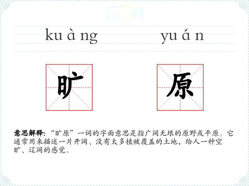 “旷原”一词的词源较为直接,由“旷”(空旷、广阔)和“原”(平原、原野)组成。在古代汉语中,类似的词汇已经存在,如“旷野”,随着时间的推移,这些词汇的含义和用法逐渐丰富和细化。