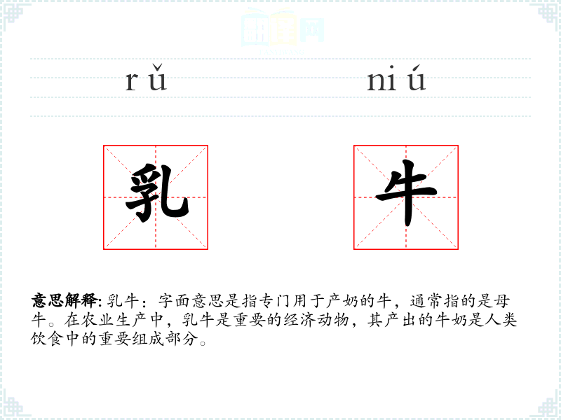 乳牛:字面意思是指专门用于产奶的牛,通常指的是母牛。在农业生产中,乳牛是重要的经济动物,其产出的牛奶是人类饮食中的重要组成部分。