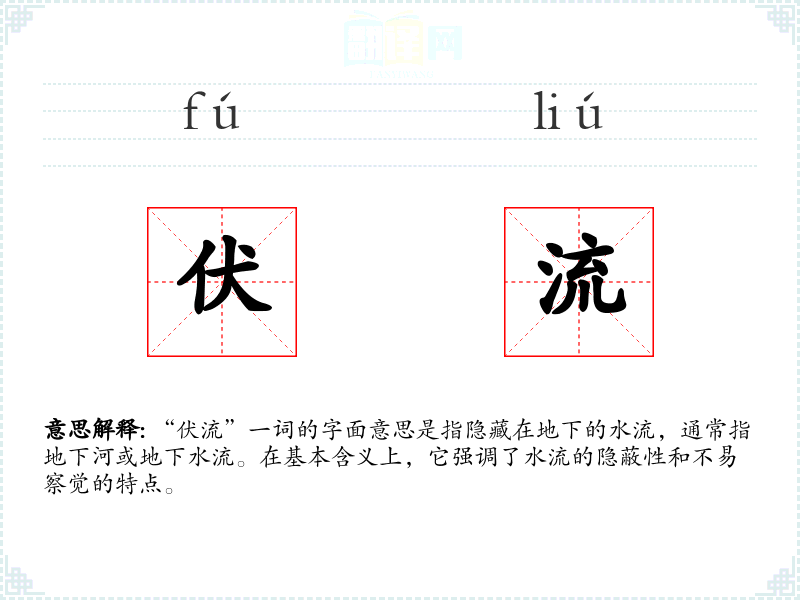 “伏流”一词的字面意思是指隐藏在地下的水流,通常指地下河或地下水流。在基本含义上,它强调了水流的隐蔽性和不易察觉的特点。
