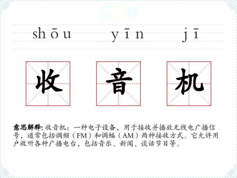 收音机:一种电子设备,用于接收并播放无线电广播信号,通常包括调频(FM)和调幅(AM)两种接收方式。它允许用户收听各种广播电台,包括音乐、新闻、谈话节目等。