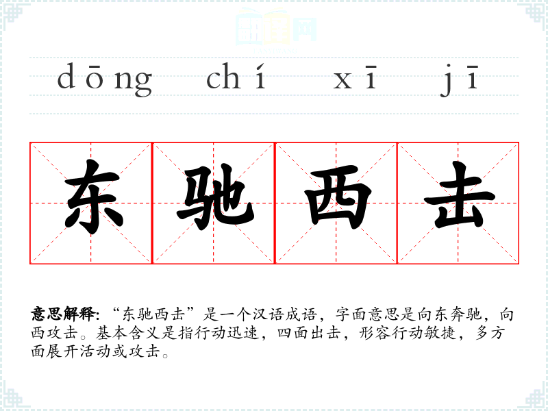 “东驰西击”是一个汉语成语,字面意思是向东奔驰,向西攻击。基本含义是指行动迅速,四面出击,形容行动敏捷,多方面展开活动或攻击。