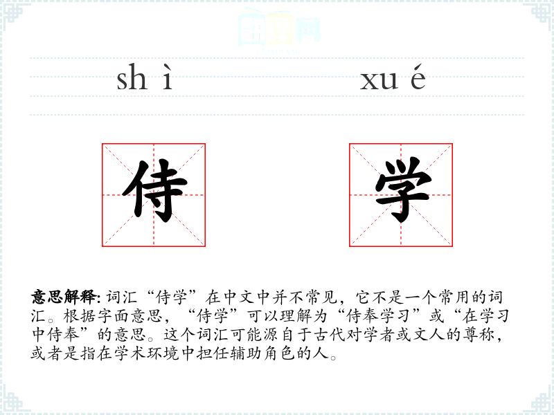 “侍学”的字面意思是指在学*或学术环境中提供服务或辅助的人。这可能包括抄写员、助理、学徒等角色。