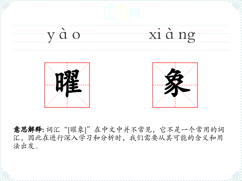 - 反义词:不太适用,因为“曜象”不是一个常用词汇,难以找到直接的反义词。
