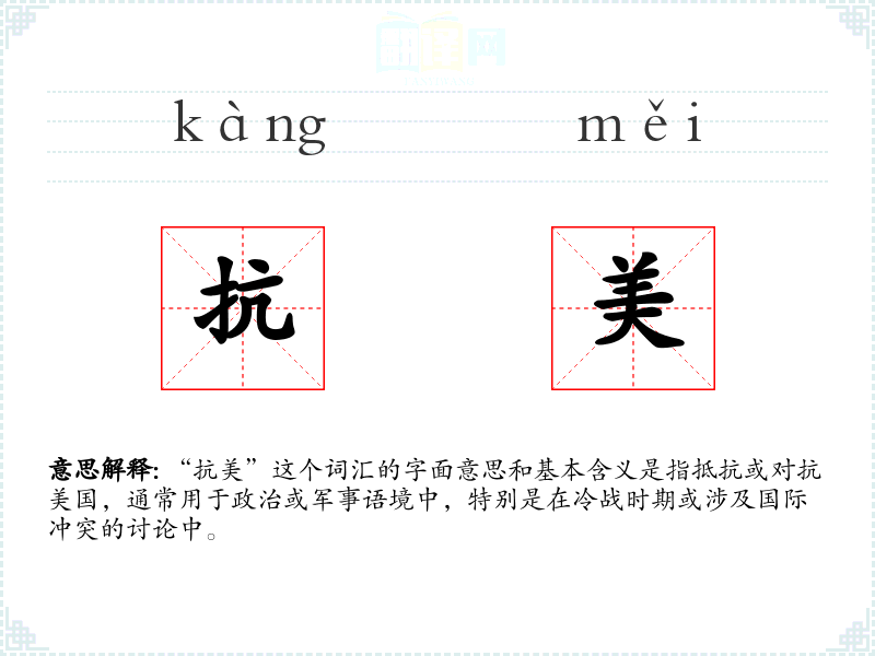 “抗美”这个词汇的字面意思和基本含义是指抵抗或对抗美国,通常用于政治或军事语境中,特别是在冷战时期或涉及国际冲突的讨论中。