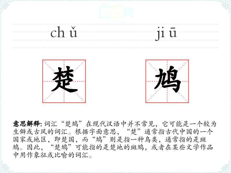 - 词源:“楚”源自古代楚国,“鸠”源自鸟类名称。