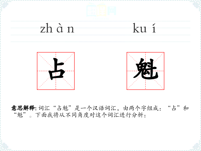 词汇“占魁”是一个汉语词汇,由两个字组成:“占”和“魁”。下面我将从不同角度对这个词汇进行分析: