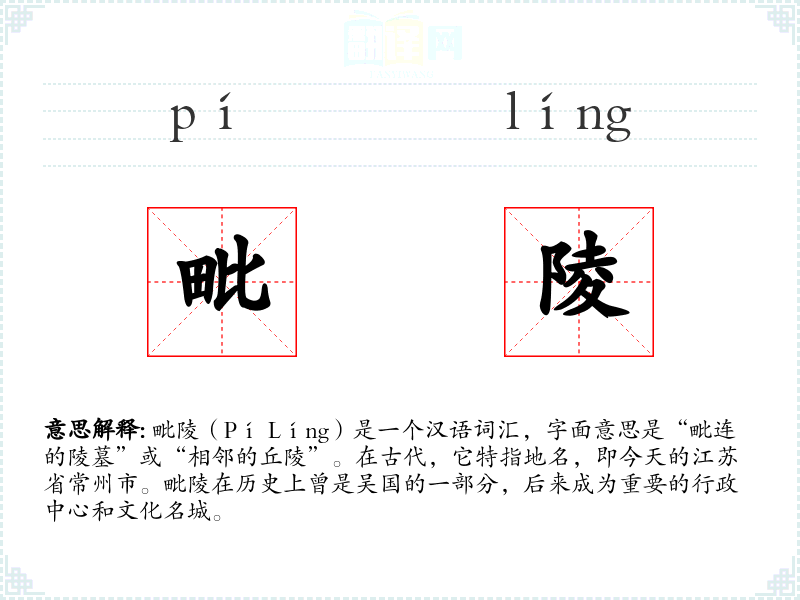 毗陵(Pí Líng)是一个汉语词汇,字面意思是“毗连的陵墓”或“相邻的丘陵”。在古代,它特指地名,即今天的江苏省常州市。毗陵在历史上曾是吴国的一部分,后来成为重要的行政中心和文化名城。
