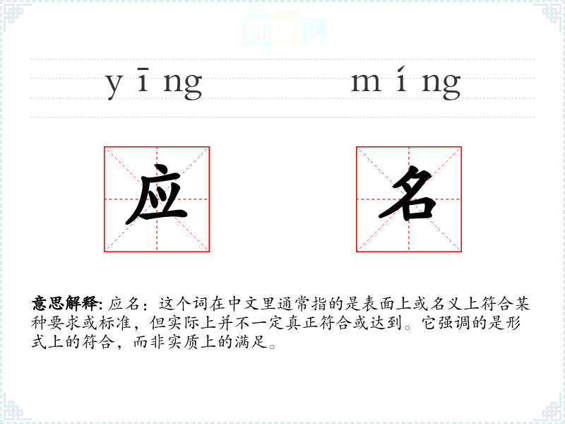 应名:这个词在中文里通常指的是表面上或名义上符合某种要求或标准,但实际上并不一定真正符合或达到。它强调的是形式上的符合,而非实质上的满足。