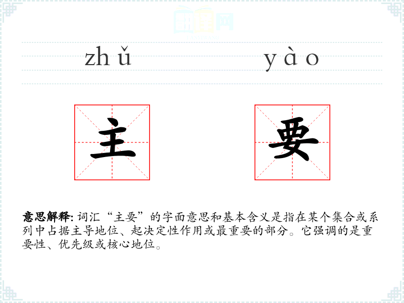 词汇“主要”的字面意思和基本含义是指在某个集合或系列中占据主导地位、起决定性作用或最重要的部分。它强调的是重要性、优先级或核心地位。