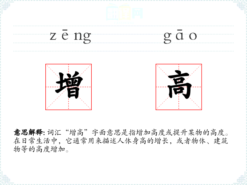 “增高”一词在中文中由“增”和“高”两个字组成。其中,“增”意味着增加或增多,“高”则指高度。这个词的结构和意义在汉语中一直保持稳定。