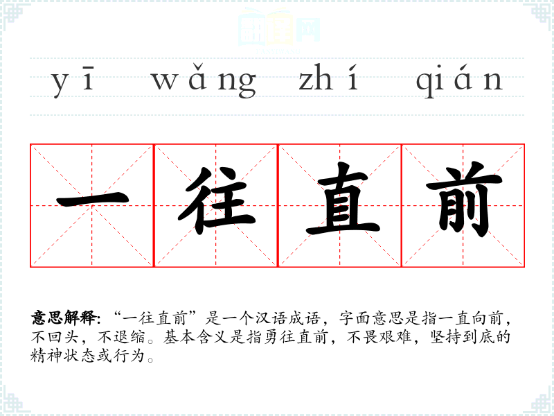 “一往直前”是一个汉语成语,字面意思是指一直向前,不回头,不退缩。基本含义是指勇往直前,不畏艰难,坚持到底的精神状态或行为。