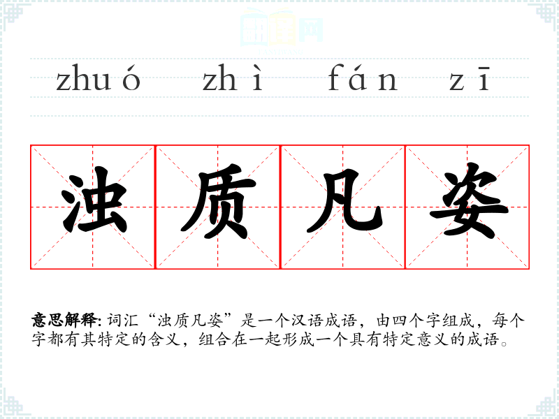 词汇“浊质凡姿”是一个汉语成语,由四个字组成,每个字都有其特定的含义,组合在一起形成一个具有特定意义的成语。