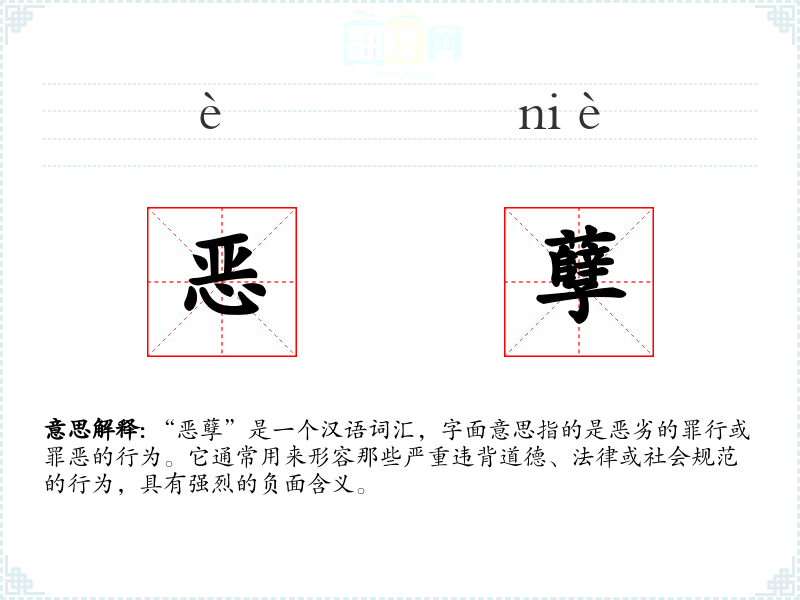 “恶孽”是一个汉语词汇,字面意思指的是恶劣的罪行或罪恶的行为。它通常用来形容那些严重违背道德、法律或社会规范的行为,具有强烈的负面含义。