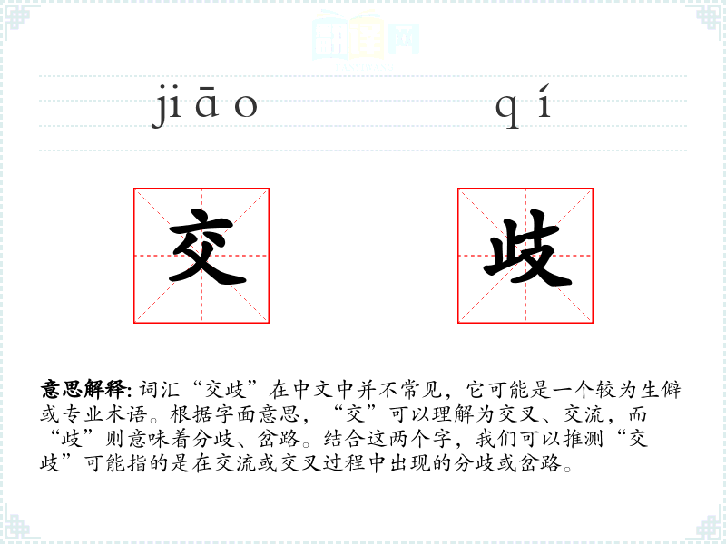 词汇“交歧”在中文中并不常见,它可能是一个较为生僻或专业术语。根据字面意思,“交”可以理解为交叉、交流,而“歧”则意味着分歧、岔路。结合这两个字,我们可以推测“交歧”可能指的是在交流或交叉过程中出现的分歧或岔路。