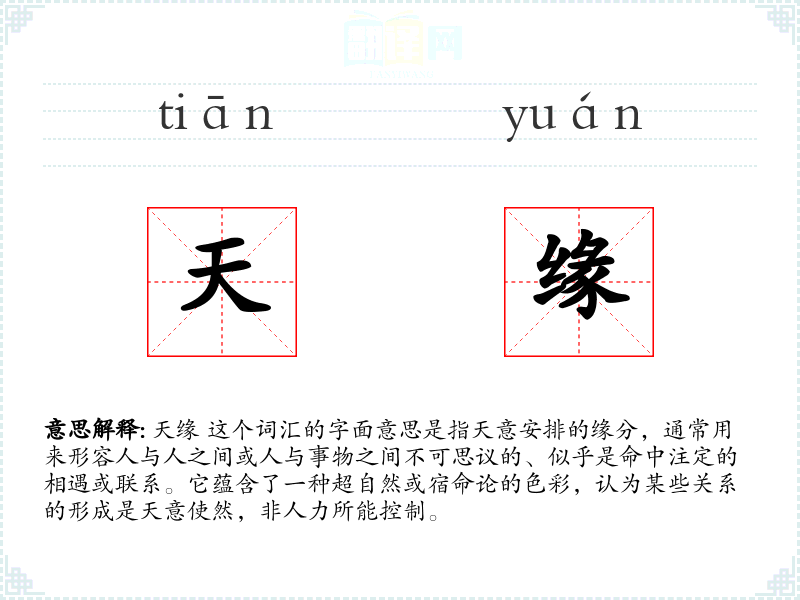 天缘 这个词汇的字面意思是指天意安排的缘分,通常用来形容人与人之间或人与事物之间不可思议的、似乎是命中注定的相遇或联系。它蕴含了一种超自然或宿命论的色彩,认为某些关系的形成是天意使然,非人力所能控制。