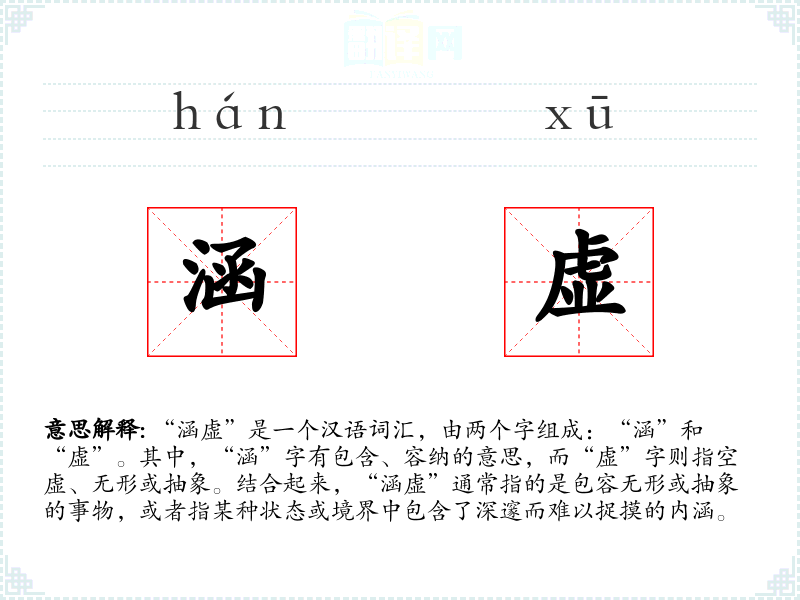 在文学中,“涵虚”常用来形容诗歌或文章的意境深远,内涵丰富而难以言表。在口语中,这个词可能不太常用,但在某些专业领域,如哲学、艺术评论中,可能会用来描述某种理论或作品的深层次意义。