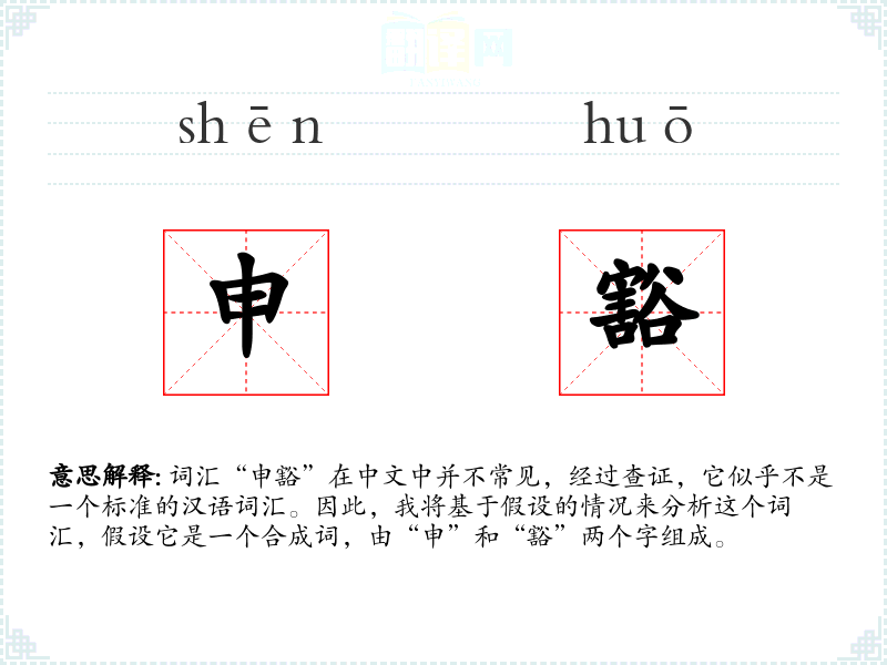 词汇“申豁”在中文中并不常见,经过查证,它似乎不是一个标准的汉语词汇。因此,我将基于假设的情况来分析这个词汇,假设它是一个合成词,由“申”和“豁”两个字组成。