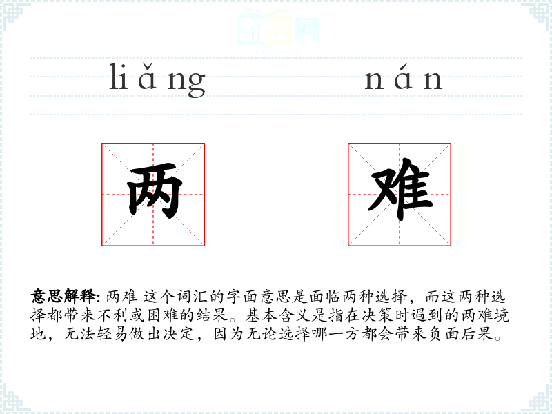 两难 这个词汇的字面意思是面临两种选择,而这两种选择都带来不利或困难的结果。基本含义是指在决策时遇到的两难境地,无法轻易做出决定,因为无论选择哪一方都会带来负面后果。