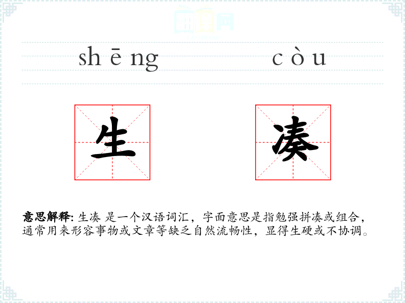 生凑 是一个汉语词汇,字面意思是指勉强拼凑或组合,通常用来形容事物或文章等缺乏自然流畅性,显得生硬或不协调。