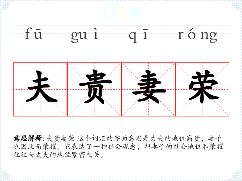 夫贵妻荣 这个词汇的字面意思是丈夫的地位高贵,妻子也因此而荣耀。它表达了一种社会观念,即妻子的社会地位和荣耀往往与丈夫的地位紧密相关。