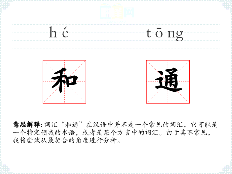 词汇“和通”在汉语中并不是一个常见的词汇,它可能是一个特定领域的术语,或者是某个方言中的词汇。由于其不常见,我将尝试从最契合的角度进行分析。