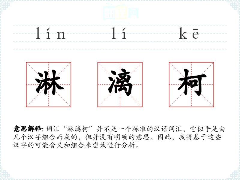 词汇“淋漓柯”并不是一个标准的汉语词汇,它似乎是由几个汉字组合而成的,但并没有明确的意思。因此,我将基于这些汉字的可能含义和组合来尝试进行分析。