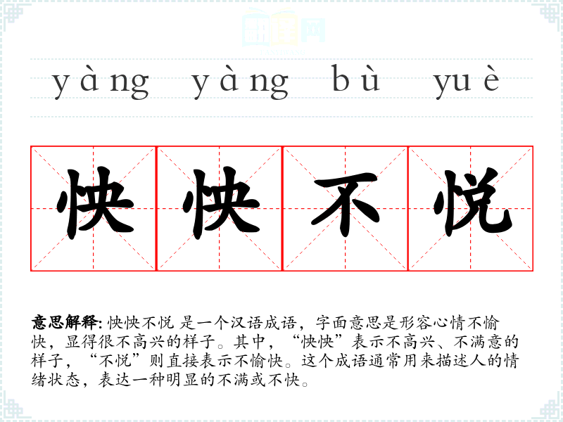 怏怏不悦 是一个汉语成语,字面意思是形容心情不愉快,显得很不高兴的样子。其中,“怏怏”表示不高兴、不满意的样子,“不悦”则直接表示不愉快。这个成语通常用来描述人的情绪状态,表达一种明显的不满或不快。