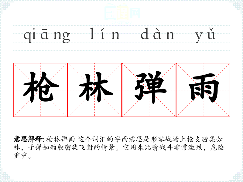 枪林弹雨 这个词汇的字面意思是形容战场上枪支密集如林,子弹如雨般密集飞射的情景。它用来比喻战斗非常激烈,危险重重。