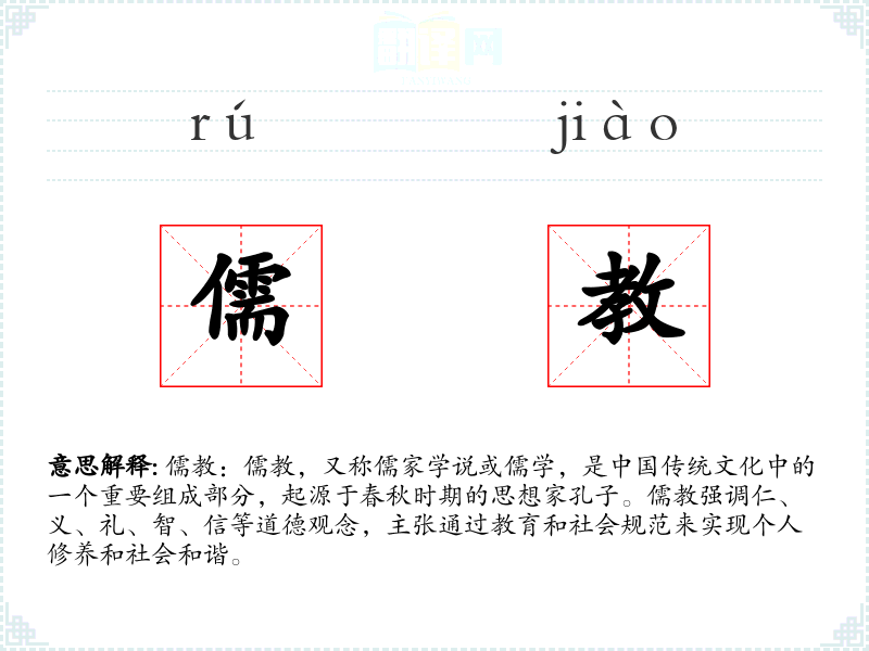 - 口语:在日常口语中,“儒教”可能被用来指代传统的教育方式或道德观念,例如:“他是个典型的儒教子弟,非常注重礼仪和传统。”