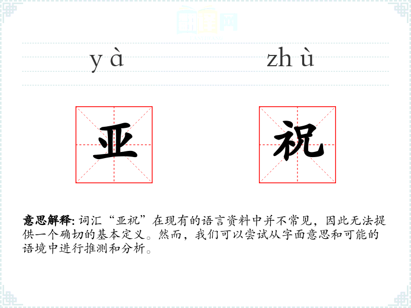词汇“亚祝”在现有的语言资料中并不常见,因此无法提供一个确切的基本定义。然而,我们可以尝试从字面意思和可能的语境中进行推测和分析。