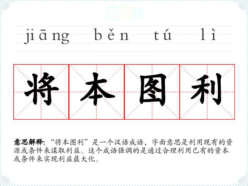 “将本图利”是一个汉语成语,字面意思是利用现有的资源或条件来谋取利益。这个成语强调的是通过合理利用已有的资本或条件来实现利益最大化。