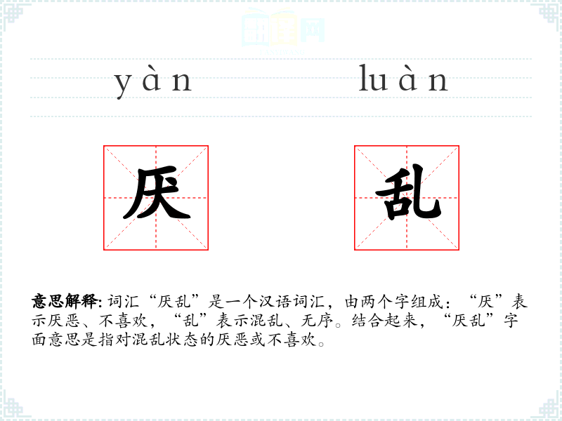 词汇“厌乱”是一个汉语词汇,由两个字组成:“厌”表示厌恶、不喜欢,“乱”表示混乱、无序。结合起来,“厌乱”字面意思是指对混乱状态的厌恶或不喜欢。