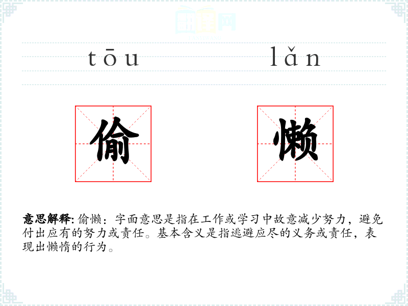 偷懒一词的词源较为直接,由“偷”和“懒”两个字组成。在古代汉语中,“偷”有偷窃、窃取的意思,而“懒”则指懒惰。随着语言的发展,这两个字组合在一起,形成了现代汉语中的“偷懒”一词。