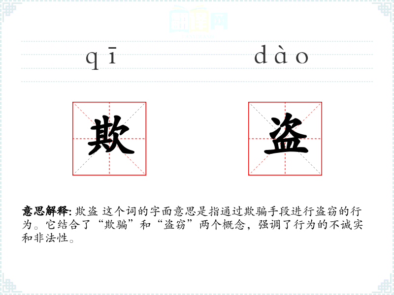 欺盗 这个词的字面意思是指通过欺骗手段进行盗窃的行为。它结合了“欺骗”和“盗窃”两个概念,强调了行为的不诚实和非法性。