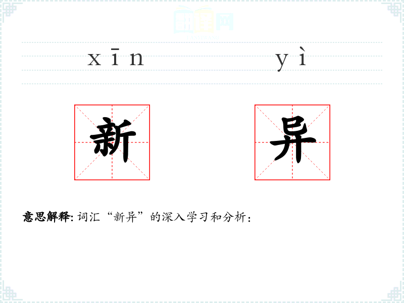 “新异”一词由“新”和“异”两个字组成,其中“新”指新鲜、未见过的,“异”指不同、特别。在古代汉语中,“新异”可能更多指新奇、罕见的事物,而在现代汉语中,它更多强调创新和独特性。