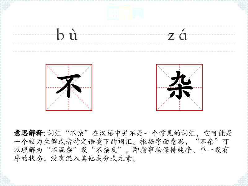 词汇“不杂”在汉语中并不是一个常见的词汇,它可能是一个较为生僻或者特定语境下的词汇。根据字面意思,“不杂”可以理解为“不混杂”或“不杂乱”,即指事物保持纯净、单一或有序的状态,没有混入其他成分或元素。