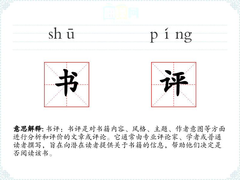 - 词源:“书评”一词由“书”和“评”组成,其中“书”指书籍,“评”指评价或评论。
