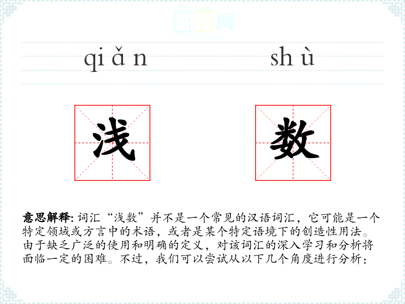 由于“浅数”不是一个标准词汇,我们无法提供一个确切的字面意思和基本含义。它可能是指“浅显的数学知识”或“简单的数字”,但这仅仅是基于字面组合的猜测。