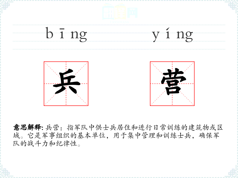 兵营一词源于古代汉语,“兵”指士兵,“营”指营地或驻扎地。随着时间的推移,这个词逐渐固定为指代军队中的居住和训练设施。