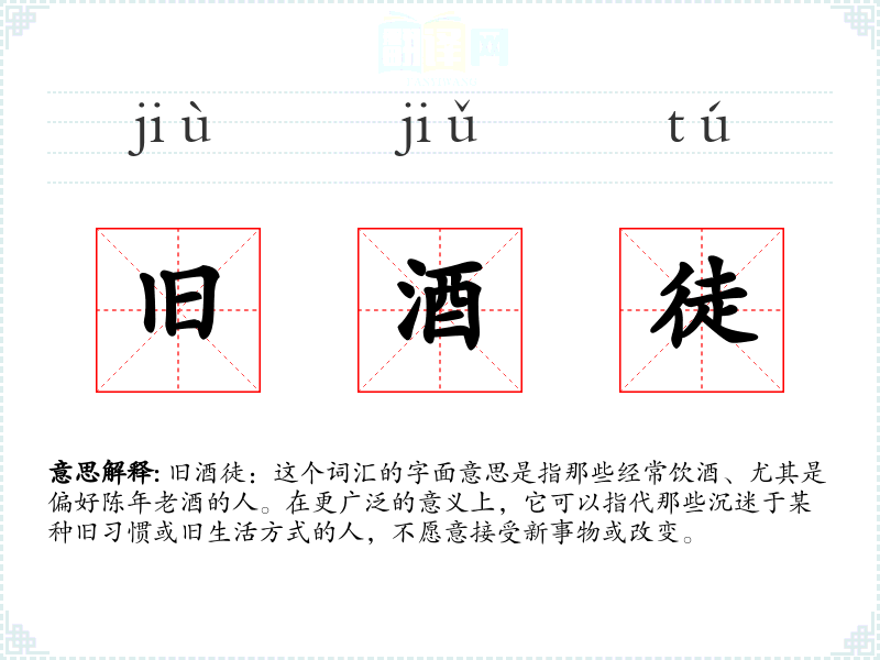 旧酒徒:这个词汇的字面意思是指那些经常饮酒、尤其是偏好陈年老酒的人。在更广泛的意义上,它可以指代那些沉迷于某种旧*惯或旧生活方式的人,不愿意接受新事物或改变。