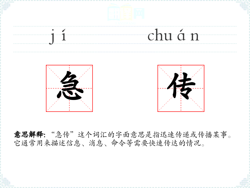 “急传”这个词汇的字面意思是指迅速传递或传播某事。它通常用来描述信息、消息、命令等需要快速传达的情况。