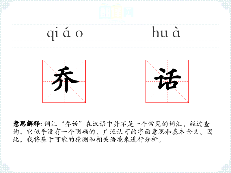 词汇“乔话”在汉语中并不是一个常见的词汇,经过查询,它似乎没有一个明确的、广泛认可的字面意思和基本含义。因此,我将基于可能的猜测和相关语境来进行分析。