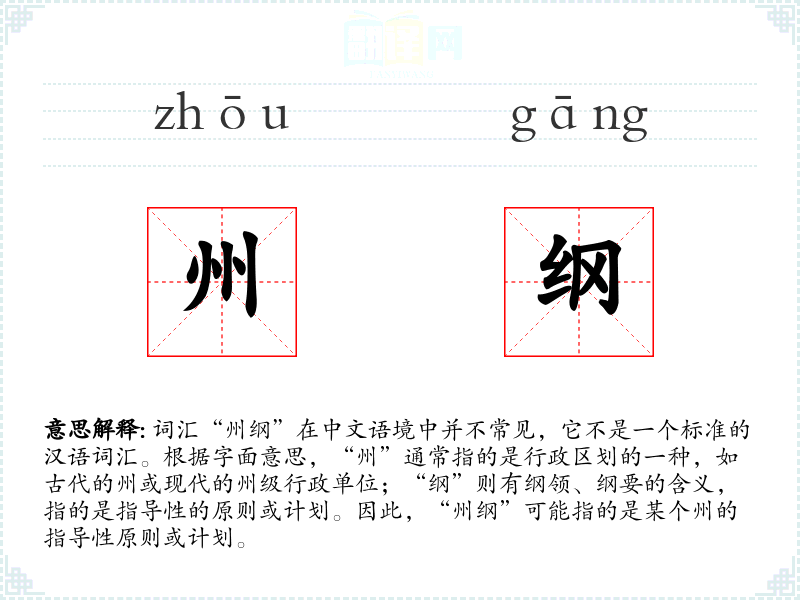 - 词源:“州”源自古代中国的行政区划,“纲”源自纲领、纲要的意思。