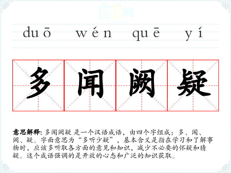 多闻阙疑 是一个汉语成语,由四个字组成:多、闻、阙、疑。字面意思为“多听少疑”,基本含义是指在学*和了解事物时,应该多听取各方面的意见和知识,减少不必要的怀疑和猜疑。这个成语强调的是开放的心态和广泛的知识获取。